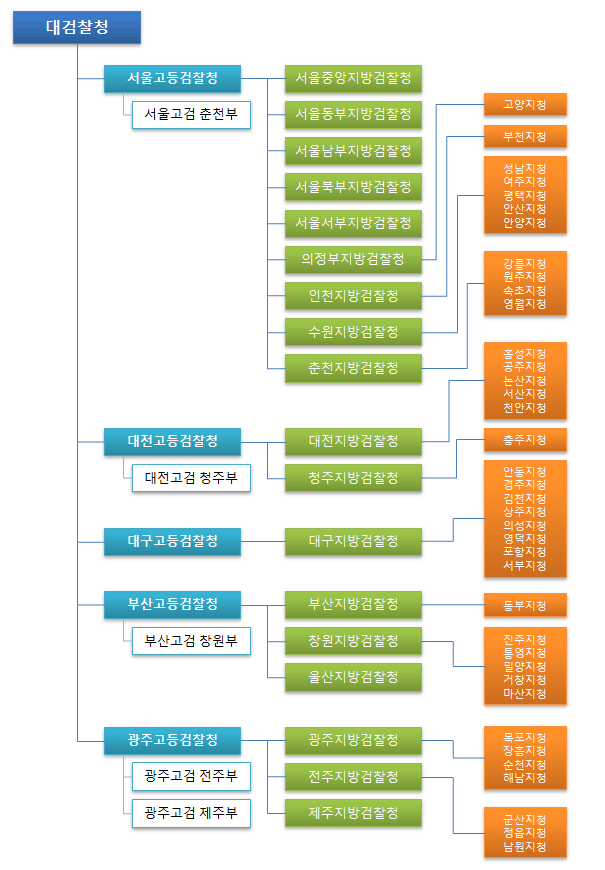 검찰 조직도, 검사 계급 순위, 대검찰청, 고등검찰청, 지방검찰청, 지청, 검찰총장, 고검장, 지검장, 지청장, 검사, 사법연수원