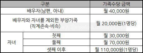 - 자녀: 첫째 30,000원, 둘째 70,000원, 셋째 이상 110,000원