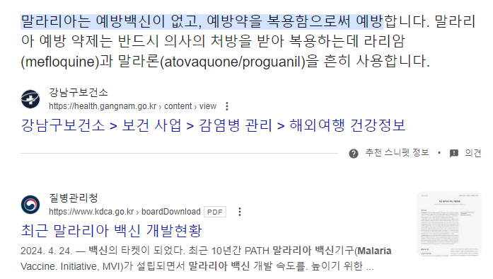 요약 키워드: 말라리아 백신, 예방약, 질병관리청, 말라리아 감염, 모기 기피제, 삼일열 원충, 아프리카 말라리아, 예방조치, 국내 말라리아 환자, 감염병 포털