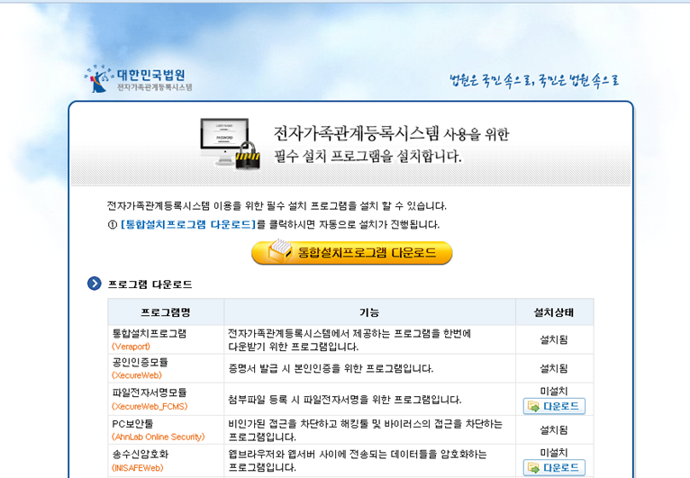 가족관계 등록 시스템은 크롬 브라우저를 사용할 수 없으므로 다른 브라우저를 이용하여 접속해야 합니다. 또한 보안 프로그램을 설치해야 하며, 통합 설치 프로그램을 다운로드하여 설치하면 편리합니다. 한 번 설치하면 계속 사용할 수 있습니다.
