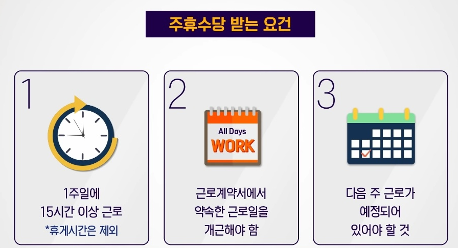 주휴수당을 받기 위해서는 몇 가지 조건을 충족해야 합니다. 첫째, 근로자는 일주일 동안 약속된 근로일을 모두 출근해야 합니다. 이는 근로계약서에 명시된 소정 근로시간을 성실히 이행해야 한다는 의미입니다. 둘째, 주 15시간 이상 근무해야 합니다. 이 두 조건을 모두 충족한 경우, 근로자는 주휴수당을 받을 자격이 생깁니다.