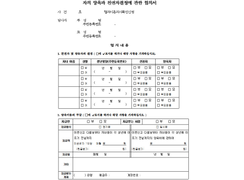 협의이혼 서류양식 은 협의이혼의사 확인신청서와 자의 양육과 친권자 결정에 관한 협의서입니다.