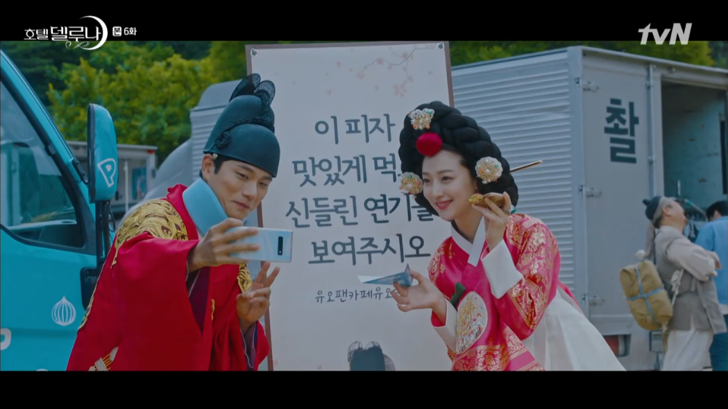호텔 델루나에 왕이 납시었다. 조선이 없어진지 110년째인데... 도대체 왕 귀신은 어디서 헤메다 이제 나타난걸까? 왕이된 남자 패러디 tvm 중전이된 여자에 왕 이현 역으로 출연했던 배우 방태우가 사망해서 왕 귀신이 된 것. 호텔 델루나는 진짜 왕인 즐 알고 vvip대접. 나중에 장만월은 속은 것을 알고 본 전을 뽑기 의해 방태우를 출연 시킨다. 중전이 된여자 이현 역을 맡은 이이경. 특별 출연이겠지? 그나저나 이 중전역 배우는 누구?사혼식 신부역 김미은 5화에 나온 사혼식 신부 귀신 역은 김미은이라는 신예 배우라고 신문 기사도 나던데... 아무튼 장만월은 이이경에게 방태우 귀신을 빙의 시켜 신들린 연기를 하게 해서 출연료를 갈취했다.