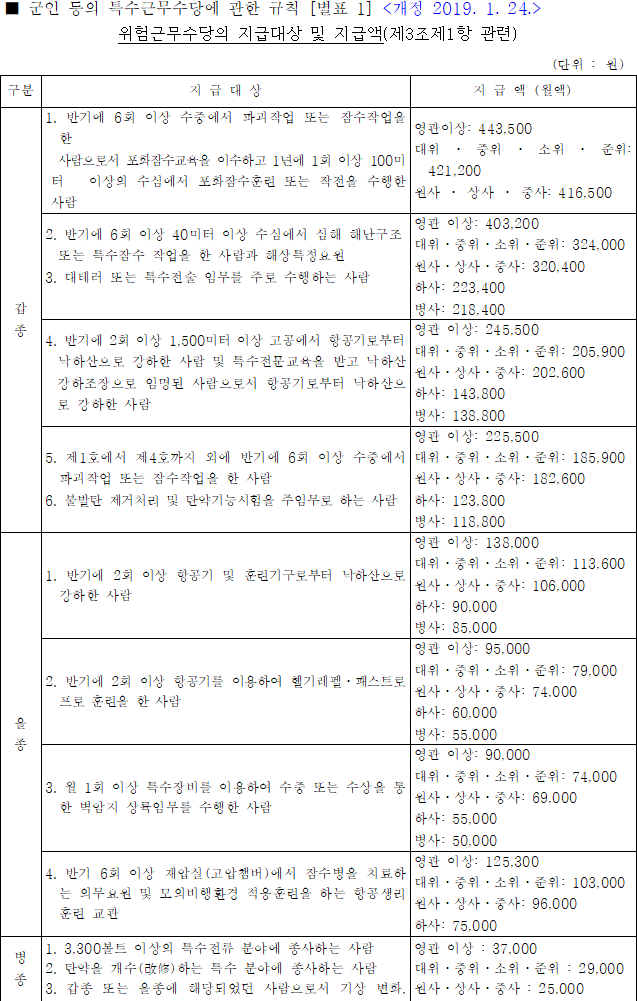 예컨데, 헬기를 항상 타고 다녀야 하는 특기의 육군 항공대 준위나, 장교 혹은 부사관들이 땅에서 편하게 행정을 보는 부사관하고 같은 월급을 받는다면 뭔가 억울하겠죠?
