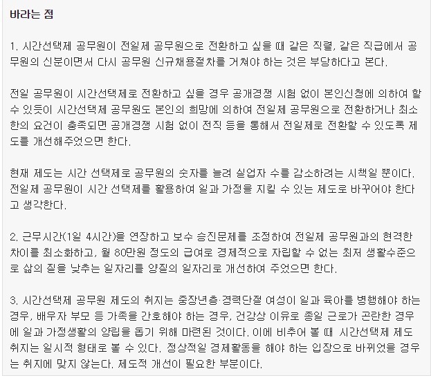 시간제 공무원 선발 대상을 경력단절 여성으로만 국한하거나, 시간선택제 공무원 폐지라고 그 인력의 절반만큼의 전일제 공무원을 뽑아야 할 것입니다.