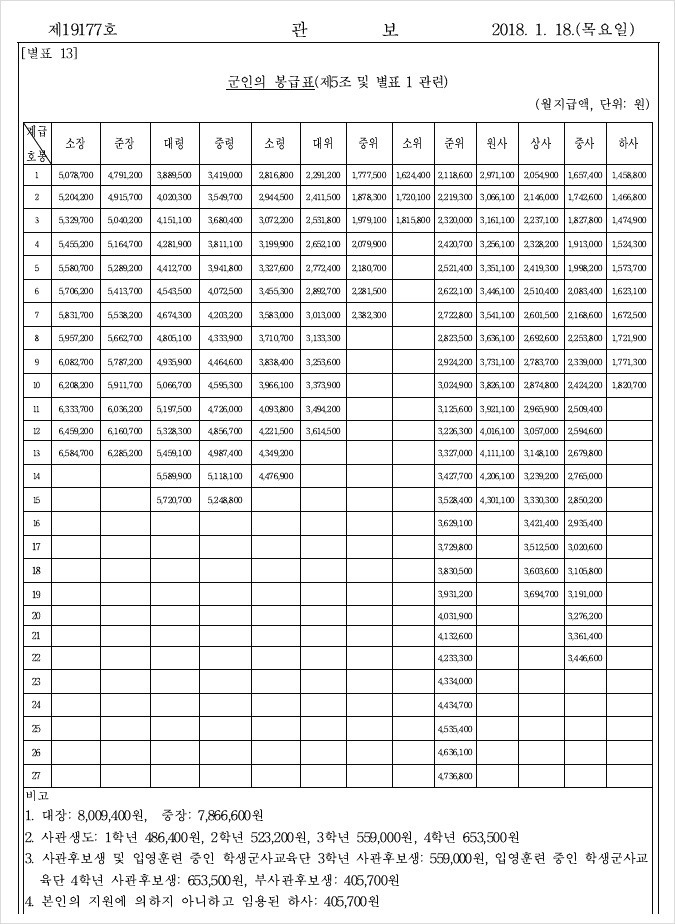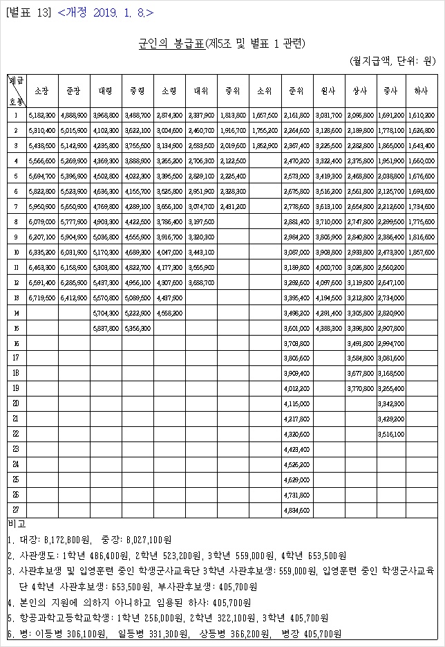 2019년 1월 8일 발표  직업 군인 월급 자료.