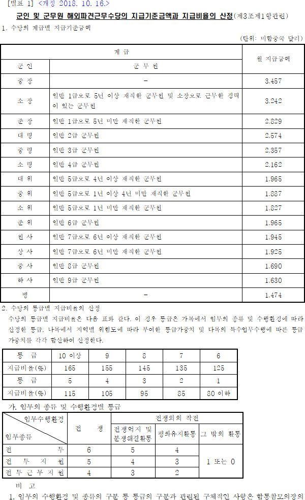 이 파병수당은 달러로 지급되고, 파병 지역의 위험도와 업무 종류 및 난이도에 따라 차등적으로 지급됩니다.