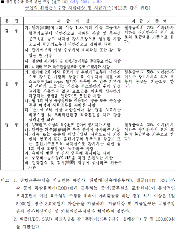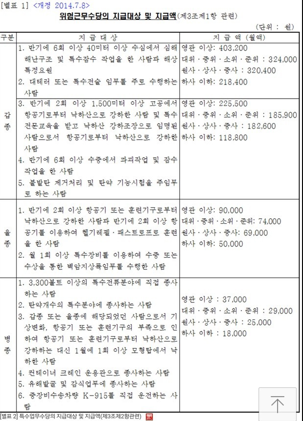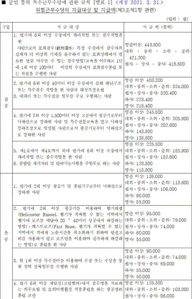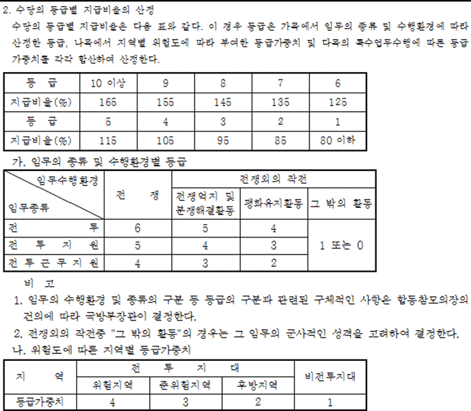 예컨대, 헬기를 항상 타고 다녀야 하는 특기의 육군 항공대 준위나, 장교 혹은 부사관들이 땅에서 편하게 행정을 보는 부사관 하고 같은 월급을 받는다면 뭔가 억울하겠죠?