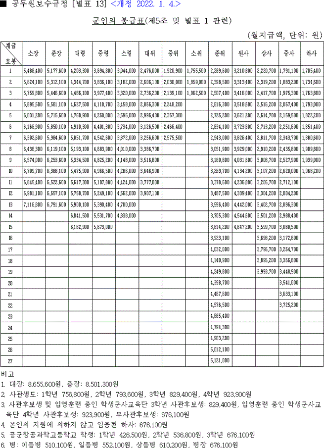 2022년 군인 봉급표