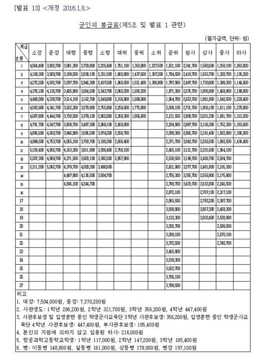 하사 월급이 증가되었으니 직업군인 월급 전체가 조정되었다.