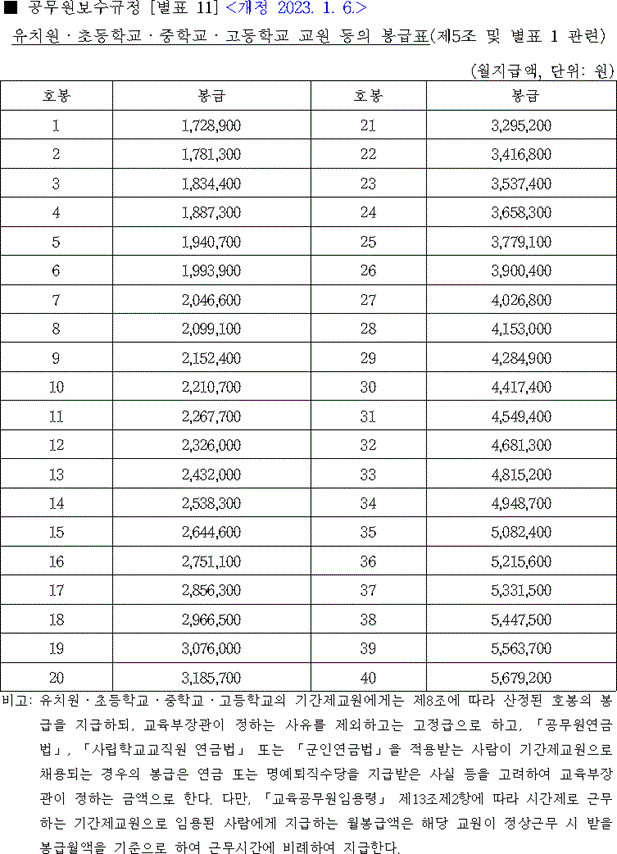 2023년 교사 호봉표 2023 교원 임금표
