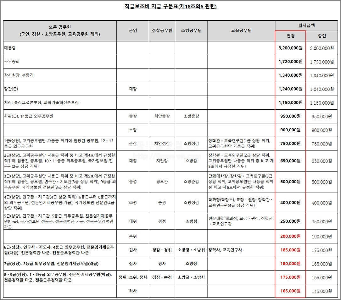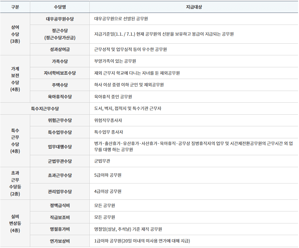 위의 표를 보면 공무원의 기본급뿐만 아니라 다양한 복지 및 수당이 포함되어 있음을 알 수 있습니다.