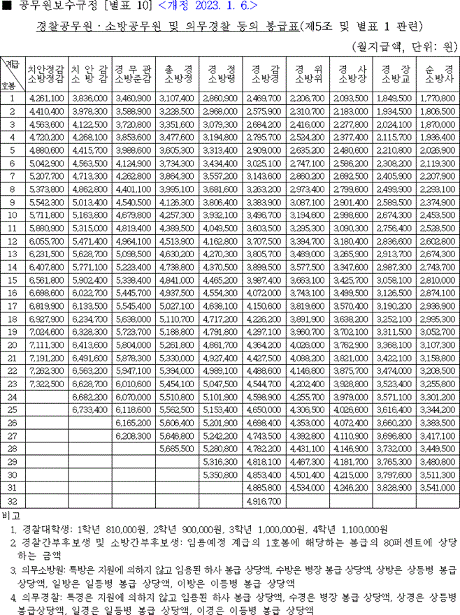 2023년 경찰공무원 봉급표 2023 소방공무원 급여표