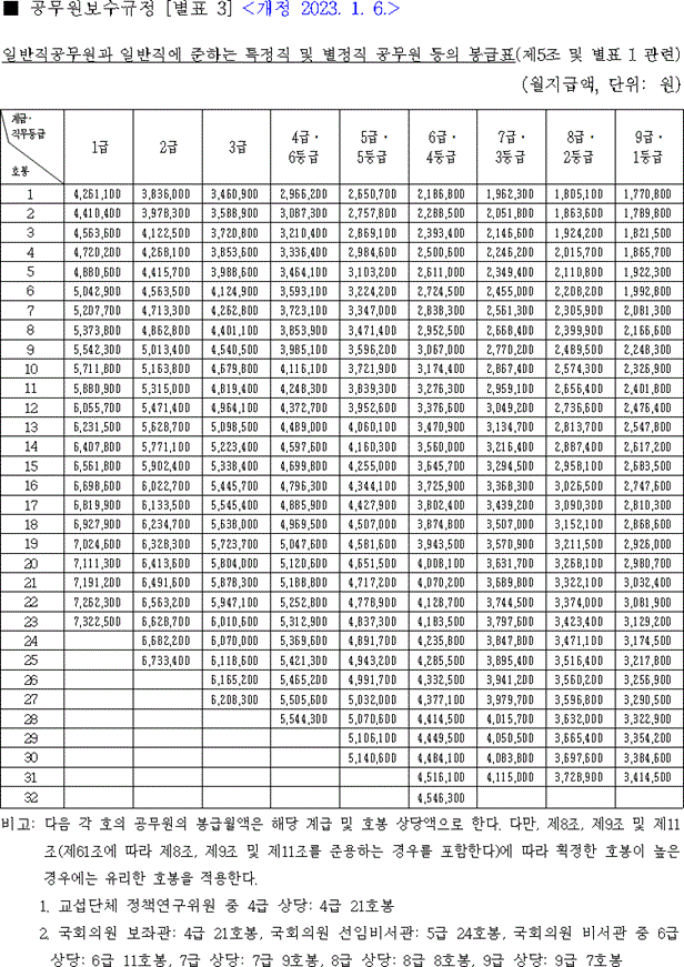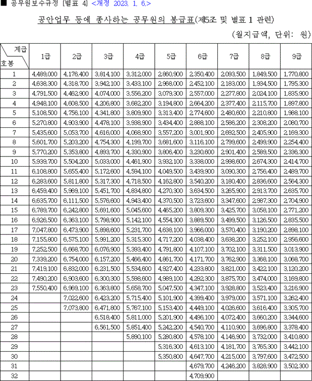이번에 인사혁신처에서 공개한 2023년 공무원 호봉표는 공무원 시험 준비 중인 분들에게 흥미로울 것입니다. 아래의 표를 살펴보세요.