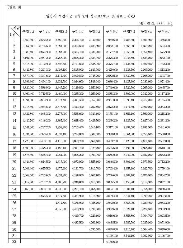 일반직 우정 직군 공무원 봉급표 집배원 월급 표