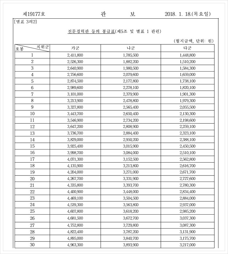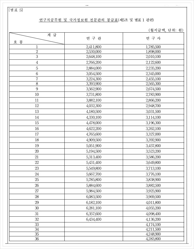 연구직 공무원 봉급표 및 국가정보원 건문관의 봉급표