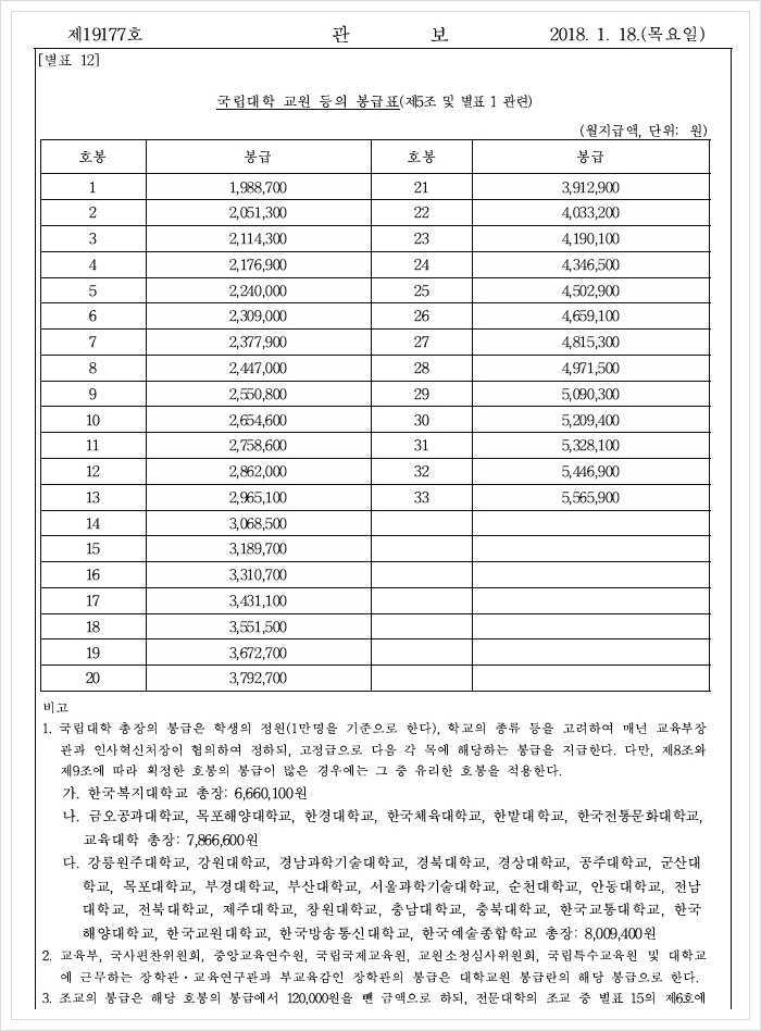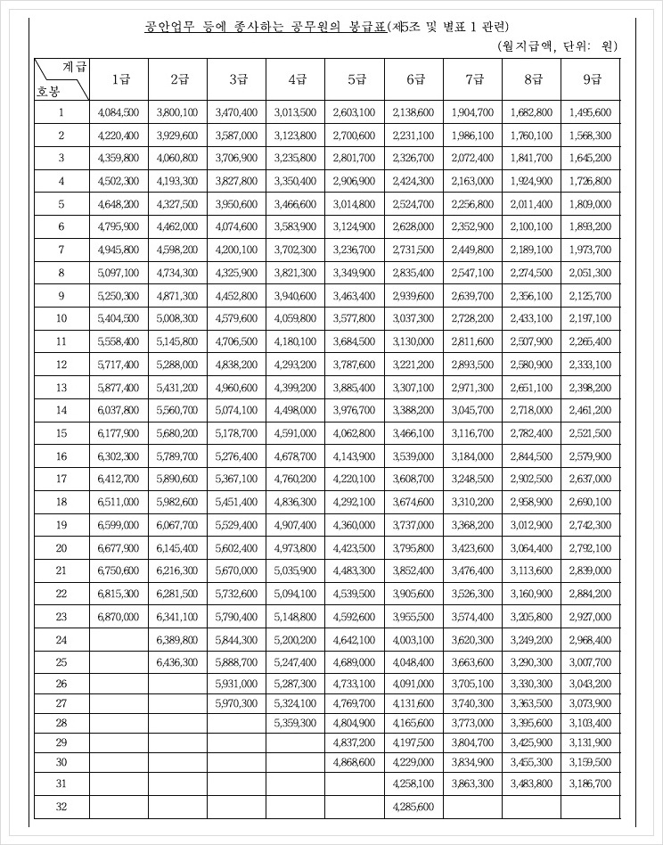 2020년 공무원 봉급표 (2020년 1월 6일 시행)