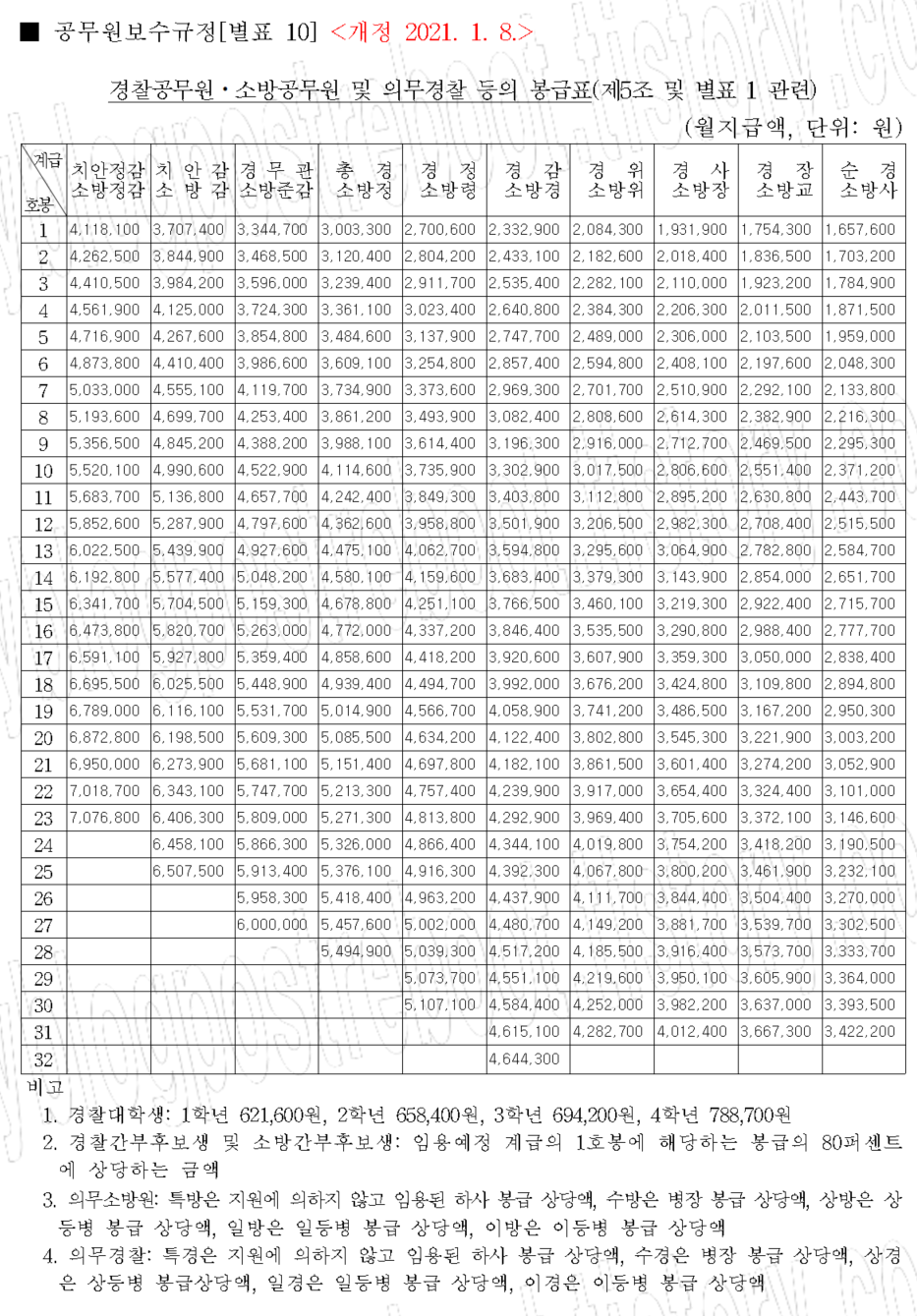 실제 발표된 2021 경찰 소방공무원 호봉표