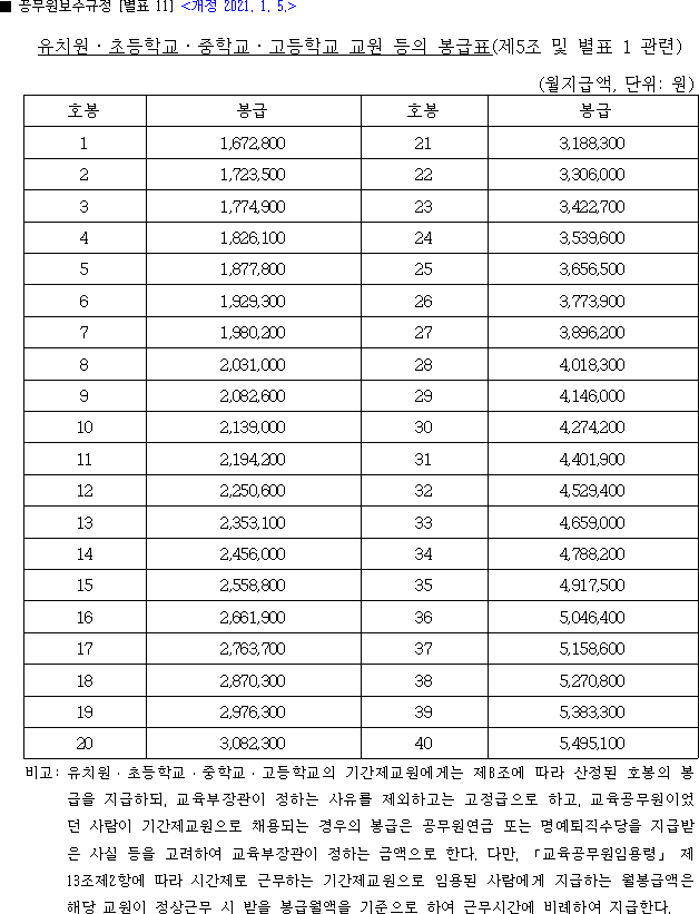 아래는 2020년과 2021년의 공무원 봉급표입니다.
